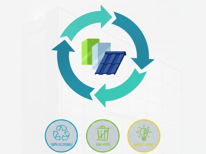 Aluminium and zinc circular economy infographic showing 100 recyclability low waste and energy savings in sustainable construction