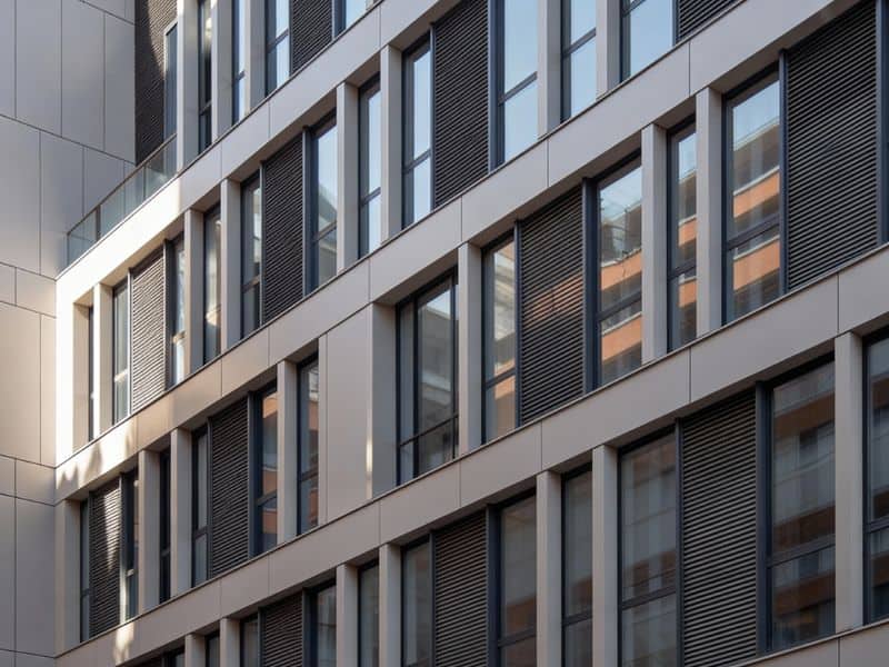 Aluminium façade cladding panels on a modern building highlighting durable and sustainable construction materials