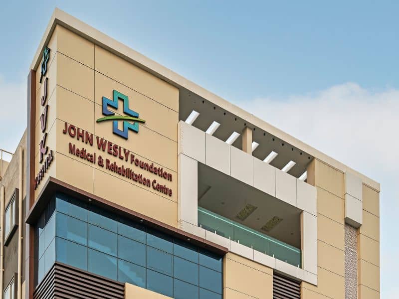 Contemporary hospital facade at JVK Hospital
